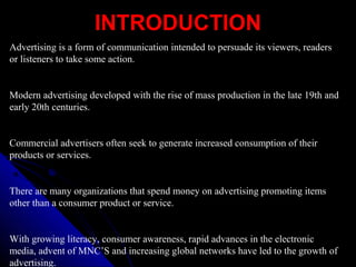 The document discusses financial advertising and its importance. Financial advertising promotes financial products and services to investors, loan, banking, and mortgage consumers. It aims to generate increased consumption of these products and services. Various media are used for financial advertising, including print, television, and radio. Satellite television proves to be an effective medium for advertising financial services to NRIs. Financial advertising campaigns are crucial for financial services businesses to gain clients and promote their brand.