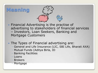 Financial advertising promotes financial services and products to key stakeholders like investors, loan seekers, and banking customers. It includes advertising for insurance, mutual funds, banking facilities, loans, brokers, and mortgages. These ads are typically found in financial newspapers, magazines, websites, TV channels, billboards, and radio to reach niche audiences. Financial advertising is important for companies to establish trust, gain new clients, and promote their financial services and products.
