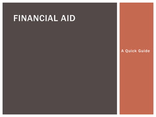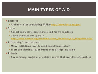 The document provides information on different types of financial aid available for college including federal, state, institutional, and private aid. It outlines steps students should take to apply for aid such as completing the FAFSA, exploring state and institutional scholarships, and searching privately for scholarships. The document also offers tips on ways to cut costs such as taking AP classes, living at home, and purchasing books elsewhere besides the university bookstore.