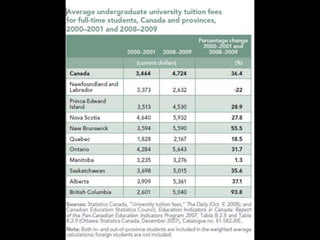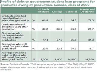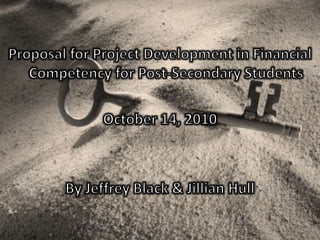 The document discusses improving students' financial literacy through expanding education on managing student loans and credit. It notes that students' knowledge of loans and credit is uneven and many do not understand the long term consequences of taking on debt. The proposal is to develop a system-wide financial literacy project in BC by embedding self-assessments and quizzes about credit into the student financial aid application process to direct students to relevant information and ensure they understand responsibilities of debt before taking out loans. The goal is to help students make better financial choices that do not hinder their future success and career prospects after graduation.