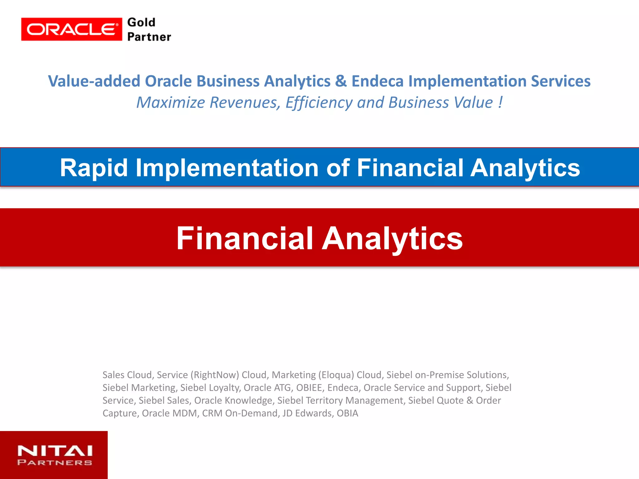 This document describes Nitai Partners' value-added Oracle Business Analytics and Endeca implementation services. It summarizes their expertise in various Oracle products including OBIEE, Endeca, Oracle ATG, Siebel, and JD Edwards. It also outlines their rapid deployment timelines for financial analytics projects, which can be completed within 12 weeks. Nitai Partners guarantees a successful deployment and implementation through specialized expertise, quality work, timeliness, reliability, and following best practices.