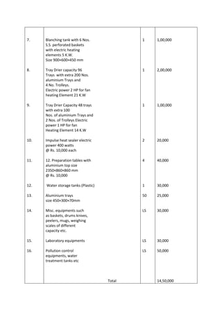 The document outlines the financial aspects of a proposed vegetable processing business, including fixed capital costs, working capital needs, and total capital investment. Fixed capital costs are estimated at Rs. 30 lakhs, including Rs. 8 lakhs for land and buildings and Rs. 17.8 lakhs for machinery and equipment. Working capital of Rs. 65.1 lakhs is required for a 3 month period to cover raw materials, utilities, wages, and other expenses like transport and advertising. The total proposed capital investment for the project is Rs. 95.1 lakhs.
