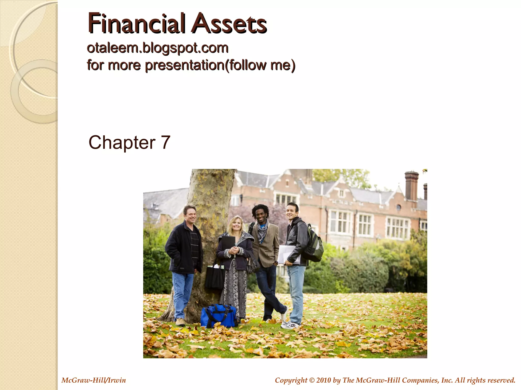 This document discusses various topics relating to financial assets, including cash, marketable securities, receivables, and notes receivable. It provides information on how these assets are valued for financial statements, cash management techniques, accounting for uncollectible accounts receivable, and calculating interest revenue for notes receivable. Worked examples are provided to illustrate estimating credit losses and recording interest earned on a short-term note receivable.