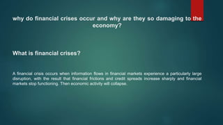 Financial crises can begin due to credit and asset price booms and busts or increases in uncertainty. This can lead to banking crises as balance sheets deteriorate and panics ensue as depositors withdraw funds. Debt deflation can then occur as the value of assets falls relative to liabilities. The 2007-2009 crisis was caused by financial innovation enabling subprime lending, agency problems in mortgage markets, and asymmetric information exacerbated by credit rating agencies. The effects included a collapse in the US housing market, deterioration of financial institution balance sheets, a run on the shadow banking system, turmoil in global financial markets, and the failure of major financial firms.