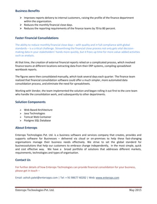 Enterops Technologies Pvt. Ltd. provides a financial data consolidation solution called eBiz Consolidation that helps organizations streamline their financial reporting processes. A reputed customer was using multiple ERP systems to generate financial data but faced challenges consolidating and reporting the data through manual spreadsheet processes. Enterops' solution automated financial reporting, reduced monthly close days, and cut the finance team's reporting workload by 70-80%. It improved report delivery and raised the profile of the customer's finance department.