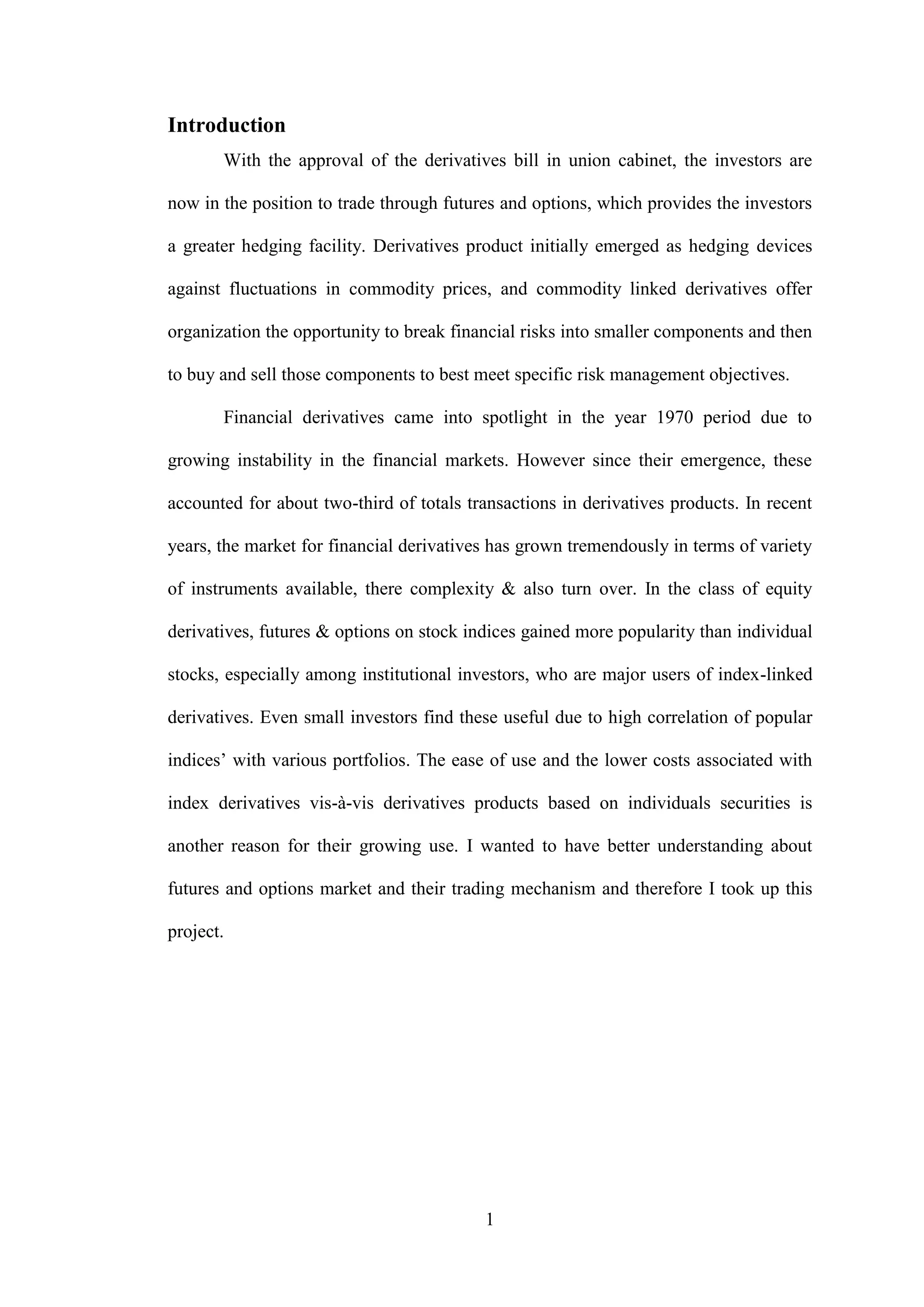 The document discusses the history and uses of derivatives in the financial markets. It begins by explaining that derivatives emerged as hedging devices against commodity price fluctuations, but now account for two-thirds of total transactions and include a variety of complex instruments. The scope of the study is on derivatives in the Indian context, specifically futures and options on two companies traded on the National Stock Exchange over one month. The objectives are to study the role of derivatives in Indian markets and analyze profits/losses of option holders. The methodology uses primary data from interviews and secondary data from publications and the internet. Derivatives are then defined as contracts deriving value from underlying assets, with the primary purpose of transferring risk between parties.