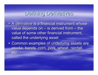 The document explains financial derivatives, focusing on futures, options, and swaps, describing how they derive value from underlying assets and how they function in transferring risk between parties. It outlines key derivatives categories, mechanisms of hedging and speculation, and provides detailed explanations of futures contracts and options, including their pricing and profit-loss scenarios. The document emphasizes the role of derivatives in improving economic performance and managing financial risks.