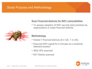 The document summarizes the key findings of a wireless vulnerability study conducted across 7 major financial districts. The study found that 57% of wireless networks used insecure encryption methods like open or WEP. It also found client devices vulnerable to attacks from openly connecting to untrusted networks and 13% actively searching for viral hotspots. The conclusions recommend best practices like implementing wireless intrusion prevention and monitoring, strong authentication and encryption, and securing guest access.