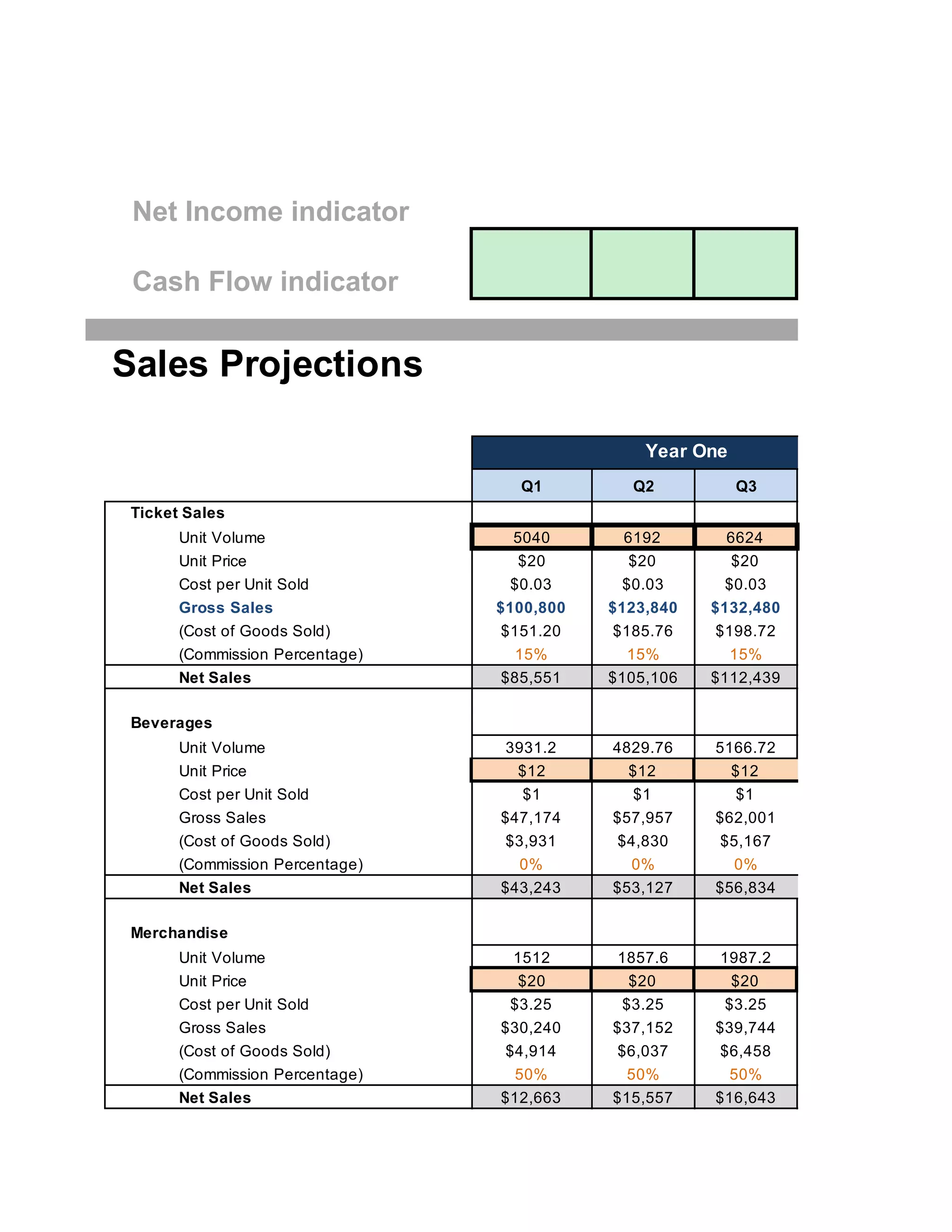 The document presents a financial projection for a business over two years, detailing income, sales, expenses, and cash flow. It includes unit sales volume, gross and net sales, cost of goods sold, and assumptions regarding consumer behavior regarding merchandise and beverages. The document outlines various marketing strategies, capital expenses, and investor contributions required to support the business's operations and growth.