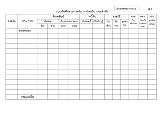 ประจาวัน ว.ด.ป. รายการ สินทรัพย์ หนี้สิน รายได้ คชจ. ใน ครัวเรือน คชจ. เกี่ยวกับ การศึกษา บุตร คชจ. ฉุกเฉิน /ทั่วไป เงินสด เงินฝากธนาคาร ชาระหนี้ เบิกเงินกู้ เงิน เดือน รับ จ้าง ลูกส่ง ให้รับ จ่าย ฝาก ถอน ยอดยกมา รวม/ยกไป เอกสารประกอบ 2 น.1