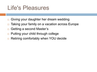 Real estate can provide long-term financial freedom through appreciation, leveraging, and tax advantages. Real estate investments allow living in the investment property while it increases in value and forces a long-term outlook. Real estate investment trusts (REITs) offer public, diversified real estate investments with minimal investment and high dividend payouts, making them suitable for beginners. Investing in real estate through vehicles like REITs can generate the financial freedom to support family goals like weddings, vacations, education, and retirement without problem.