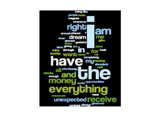 The document expresses gratitude for always being in the right place at the right time and meeting the right people, which leads to unexpected opportunities and receiving unexpected checks and gifts in the mail without asking. It describes a state of having more than enough money for anything wanted through money effortlessly flowing and resources being abundant, allowing the attainment of a dream home, car, and luxuries while attracting money like a magnet whenever wanted through being generous and giving.