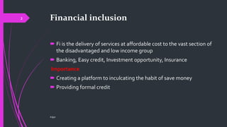 This document discusses financial inclusion, credit widening, and credit deepening. It defines financial inclusion as providing access to affordable financial services like banking, credit, insurance to disadvantaged and low-income groups. It summarizes schemes launched in India to promote financial inclusion like PMJDY and steps taken by RBI like appointing business correspondents. Financial deepening is defined as offering a wider range of financial products and services from various financial institutions. Financial widening means accumulating financial assets at a faster pace than non-financial wealth.