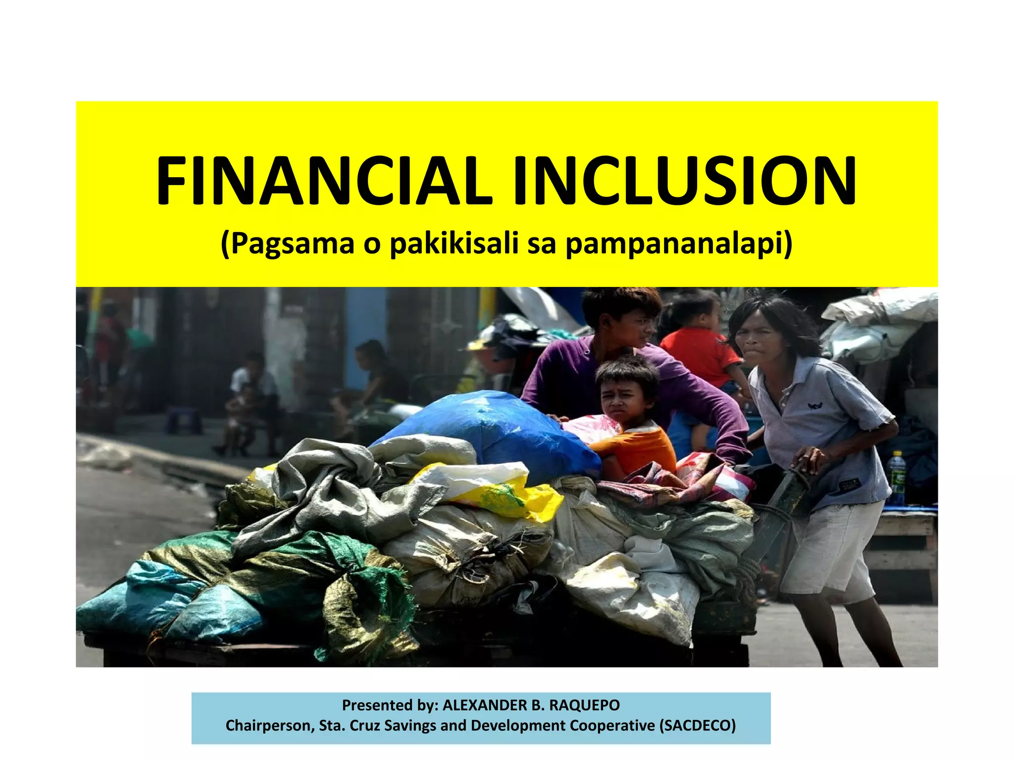 This document discusses financial inclusion, which refers to effective access to a wide range of affordable financial services for all individuals. These services include savings, credit, insurance, and payments. The importance of financial inclusion is that it improves lives, supports business growth, and contributes to economic stability. However, obstacles like hard-to-reach populations and lack of financial literacy impede greater inclusion. Cooperatives can help promote inclusion through various programs like microfinance, insurance, financial literacy training, and serving as payment centers. Being an active cooperative member is key to achieving financial inclusion.
