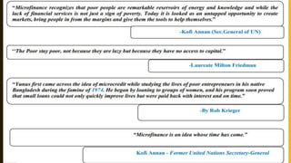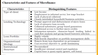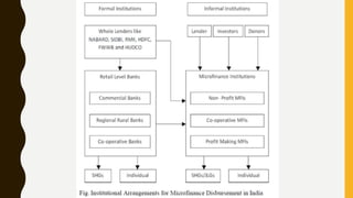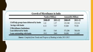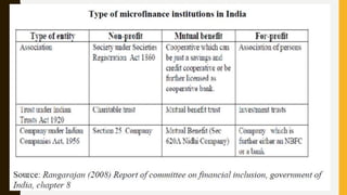 The document discusses the importance of financial inclusion in India, highlighting its objectives, delivery methodologies, and the significant role of microfinance in supporting low-income groups. It outlines various initiatives and progress made towards achieving financial inclusion, including the increase in banking outlets, access to credit, and the emergence of technology in finance. Additionally, it addresses challenges and defines key concepts related to microfinance, emphasizing the need for targeted financial services for the underserved population.