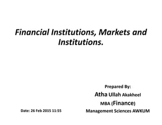 This document defines key terms in finance and describes various financial institutions and markets. It begins by defining finance, money, and credit. It then discusses two main classifications of finance - public and private. Next, it examines different types of financial institutions like banks, investment companies, insurance companies, and credit unions. It also explores various financial markets and instruments. In closing, the document emphasizes the relationship between financial institutions and markets.