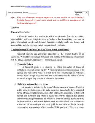 This document provides information about a student's assignment submission for a course on Financial Markets and Institutions. It includes the student's details, assignment details such as course code, submission date, and signature. It also includes sections for the tutor to fill out including date of receiving assignment, marks obtained, comments, and date of returning the assignment with the tutor's signature. The assignment questions ask about the importance of financial markets, components of the financial system, roles of the central bank, and functions of money.