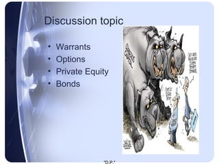 The document summarizes various types of financial instruments including warrants, options, private equity, and bonds. Warrants give the holder the right to purchase shares at a specified price within a set time period. Options provide the opportunity to buy or sell an asset at a stated price on or before expiration. Private equity consists of non-publicly traded equity securities and includes leveraged buyouts, venture capital for launching or expanding businesses, and growth capital for more mature companies. Bonds are debt securities where the issuer owes principal and interest to holders at maturity.