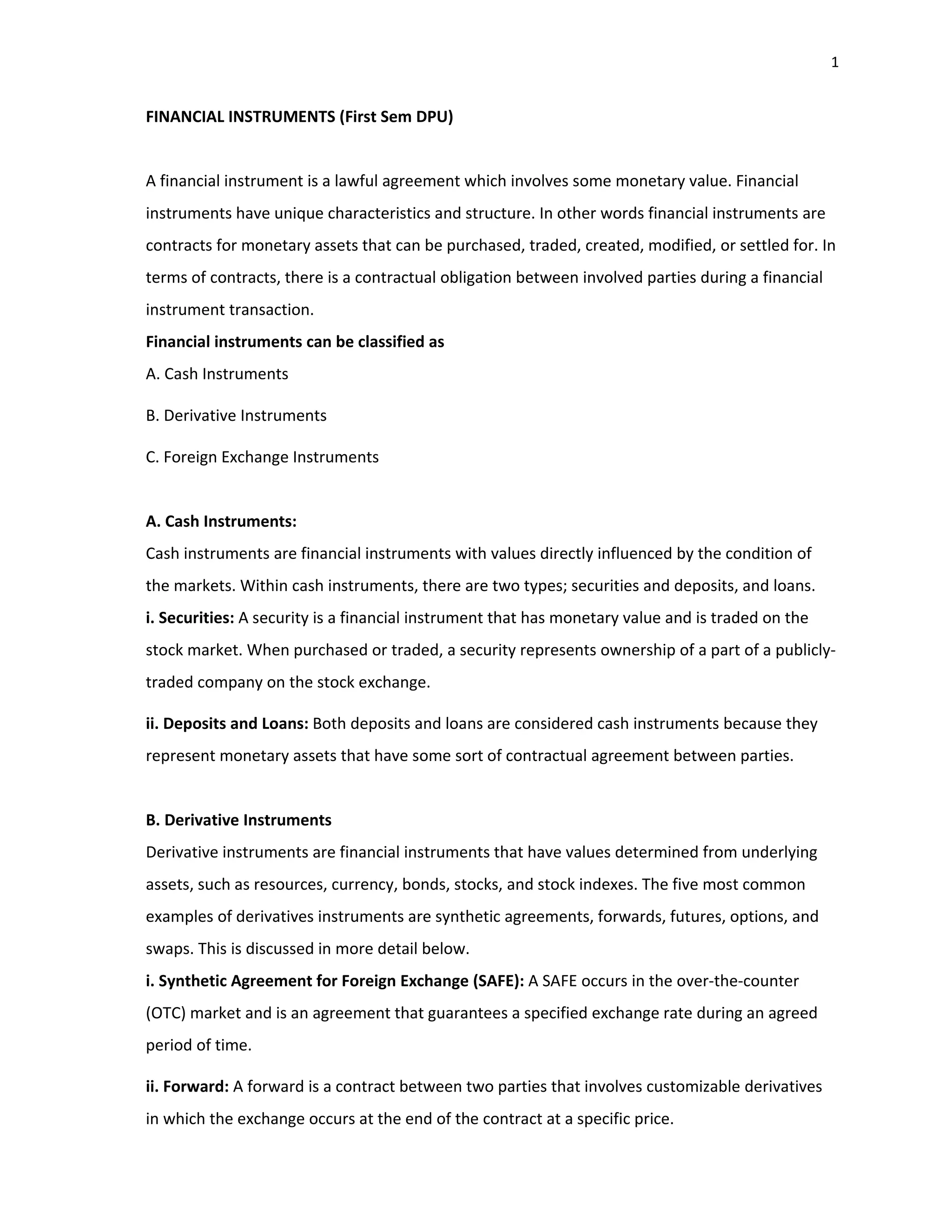The document outlines the various types of financial instruments, including cash instruments, derivative instruments, and foreign exchange instruments, detailing their characteristics and functions. It also discusses the primary market's operations, including methods of issuing securities such as IPOs, private placements, and underwriting processes. Additionally, the document explains the concept of share buybacks, including reasons and methods for companies to repurchase their shares.