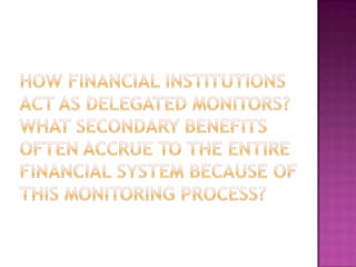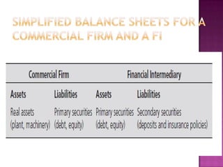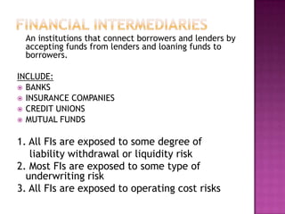This document discusses the roles and functions of financial institutions (FIs). FIs connect borrowers and lenders by accepting funds from lenders and loaning them to borrowers. They serve as conduits between savers and users of funds by providing brokerage functions and transforming assets. Specifically, FIs issue securities like deposits that are attractive to savers and use the funds to purchase corporate securities, providing liquidity and reducing risk.