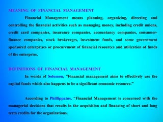 1) Financial management involves planning, organizing, and controlling a company's monetary resources and their efficient use.