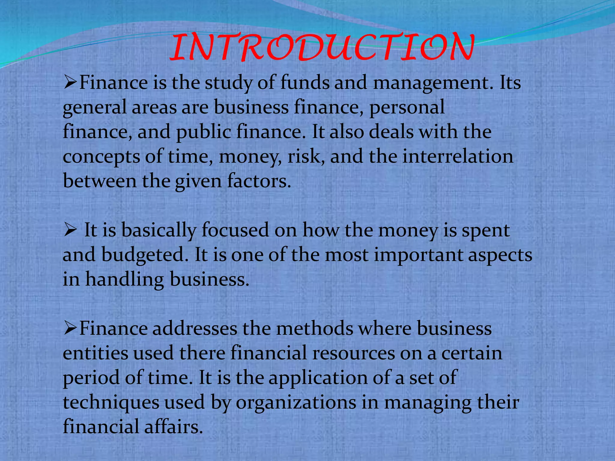 1. It defines finance as the study of funds and their management in areas like business, personal, and public finance.