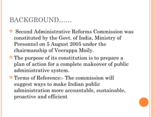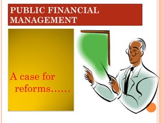 The document discusses reforms to public financial management in India based on recommendations from the Second Administrative Reforms Commission. It outlines weaknesses in budgetary processes, resource allocation, and expenditure management. The reforms aim to strengthen financial management systems through improved revenue collection, debt and cash management, planning processes, oversight, and use of modern practices like accrual accounting. Core principles for reform include ensuring financial management is part of governance reforms and adopting transparency, flexibility, and a focus on results.