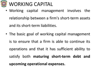 This document provides information on working capital management. It discusses key concepts related to working capital such as net working capital, gross working capital, and approaches to financing working capital. The conservative, aggressive, and matching approaches are explained. Components of working capital like cash, inventory, debtors, and creditors are also summarized. Techniques for managing these components like economic order quantity, stock levels, and cash management models are outlined as well.