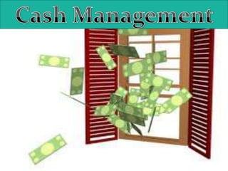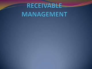 This document provides an overview of receivable management, cash management, and inventory management. It discusses key aspects of managing debtors, including establishing credit policies, analyzing customer creditworthiness, and controlling receivables. It also outlines important factors in cash management like meeting payment schedules and minimizing cash balances. Additionally, the document defines inventory, describes inventory costs and reasons for holding inventory, and lists techniques for inventory control like the economic order quantity model.