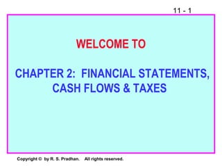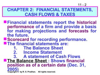The document provides an overview of financial analysis tools including financial statements, ratios, and common size statements. It discusses the three main financial statements - the balance sheet, income statement, and statement of cash flows. It then explains how to analyze these statements using common size statements, which express each line item as a percentage of total assets or total sales. Finally, it introduces financial ratio analysis, explaining that ratios are useful for assessing a firm's financial strengths and weaknesses and serving as a basis for decision making. Ratios are computed by dividing one number by another and can provide more informative insights than raw numbers alone.