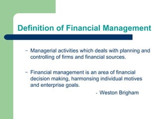 The document discusses various aspects of financial management including its definition, scope, traditional and modern approaches, functions, objectives, and sources of finance. Specifically, it defines financial management as dealing with planning and controlling a firm's financial resources. It also discusses the functions of investment, financing, and dividend decisions and how financial management aims to maximize profit and shareholder wealth.