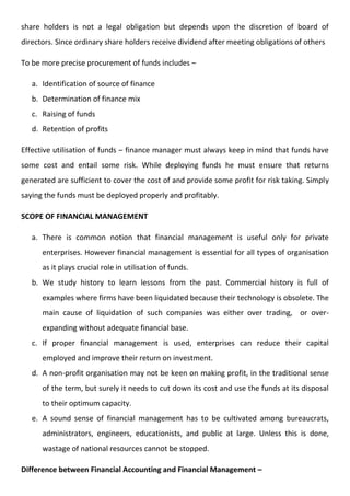 Financial management involves both procuring funds from various sources like equity and debt, as well as effectively utilizing those funds. The main functions of a financial manager include estimating funding needs, determining capital structure, making investment decisions, and managing cash flow.