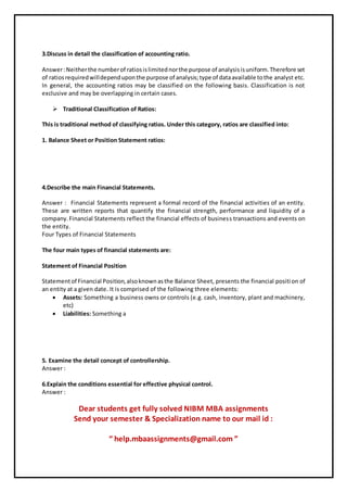 This document provides instructions for MBA students to submit their semester assignments for grading. It lists 6 financial management questions, each worth 25 marks, and instructs students to answer any 4 questions. For each question, the answer should be a minimum of 2 pages or 300 words. It provides the contact email and phone number for students to send their semester name and specialization to receive fully solved assignments.