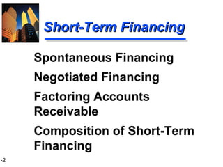 This document discusses various methods of short-term financing including spontaneous financing like trade credit and negotiated financing like commercial paper, bankers' acceptances, and short-term business loans. It also covers secured loans backed by accounts receivable or inventory, as well as factoring which involves selling accounts receivable to a financial institution. The best mix of short-term financing methods depends on factors like cost, availability, timing, flexibility, and degree to which company assets are encumbered.