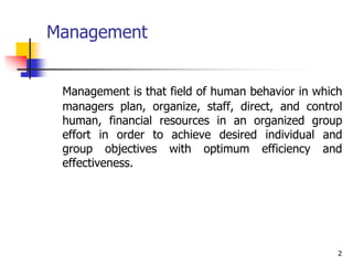 This document discusses the concepts of management and financial management. It defines management as planning, organizing, staffing, directing, and controlling resources to achieve organizational goals efficiently and effectively. Financial management involves procuring and utilizing funds, and is the management of money and other assets for individuals, businesses, and governments. The objectives of financial management are typically described as profit maximization or wealth maximization, with wealth maximization being considered a more comprehensive goal that takes into account risk, return, and the time value of money.