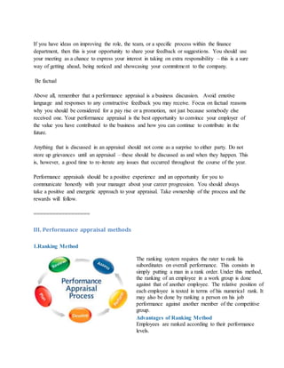 This document outlines various aspects of financial performance appraisal, including preparation tips, methods, and the importance of having a future-focused outlook during appraisals. It discusses different appraisal methods such as ranking, rating scales, checklist, critical incidents, essay, and behaviorally anchored rating scales, along with their advantages and disadvantages. Overall, the document emphasizes the need for factual discussions in appraisals to effectively communicate value and career goals.