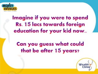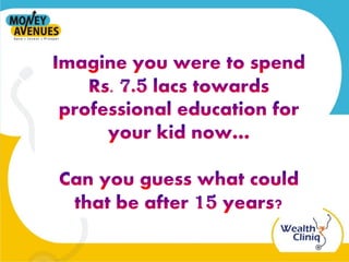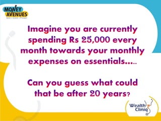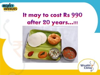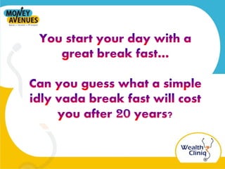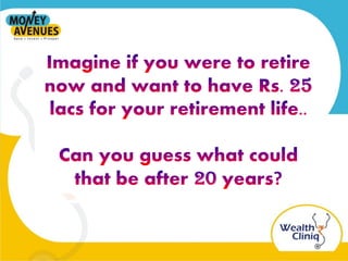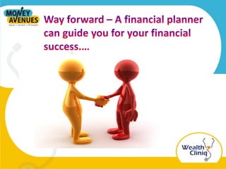 This document discusses the importance of financial planning and outlines key factors to consider. It recommends planning for tax, retirement, children's education, investment, health insurance, life insurance, and goals. It emphasizes starting investments early to benefit from compounding returns over many years. Later examples show that even with lower returns, starting investments earlier leads to higher overall gains compared to starting later with higher returns. The document stresses having adequate life and health insurance coverage and notes taxes can be saved under Section 80D of India's tax code. It concludes by highlighting the importance of financial planning and guidance from a professional financial planner.