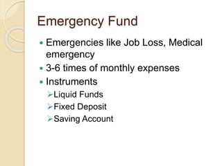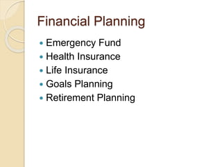 The document outlines key aspects of financial planning, including the importance of an emergency fund, health and life insurance, and goal setting for short and long term objectives. It emphasizes the necessity of retirement planning, detailing required monthly investments based on different interest rates to achieve desired retirement corpus and children's education goals. Additionally, it compares various tax-saving instruments and investment options, demonstrating the significance of starting early to maximize returns through compounding.