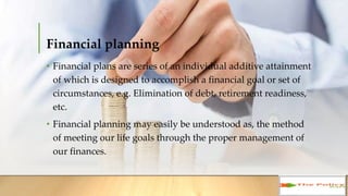 Financial planning involves managing finances to achieve life goals such as eliminating debt or preparing for retirement. It provides direction for financial decisions, emphasizing the importance of setting clear financial goals and monitoring expenses. Key principles include creating a budget, saving money, securing family finances through insurance, and staying informed about financial strategies.