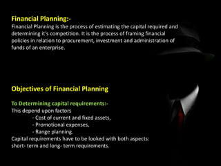Financial planning and forecasting involves determining capital requirements, framing financial policies, and assessing future financial performance. Financial planning is the process of estimating needed capital and determining sources, while financial forecasting extends planning by making inferences about future sales, expenses, cash flows, and financial positions. Forecasting techniques include regression analysis of historical relationships, creating pro forma financial statements using past ratios or estimated expenses, and functional budgeting through cash, sales, and operational budgets.