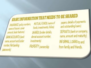 This document contains information about sharing financial decisions with a spouse. It discusses how investing in a spouse's name can help cut taxes. Specifically, it provides four tax-efficient strategies for couples, such as investing in tax-free investments like the Public Provident Fund or equity mutual funds to avoid additional tax liability. The document also discusses how gifting gold jewelry instead of cash to a spouse does not generate any taxable income.