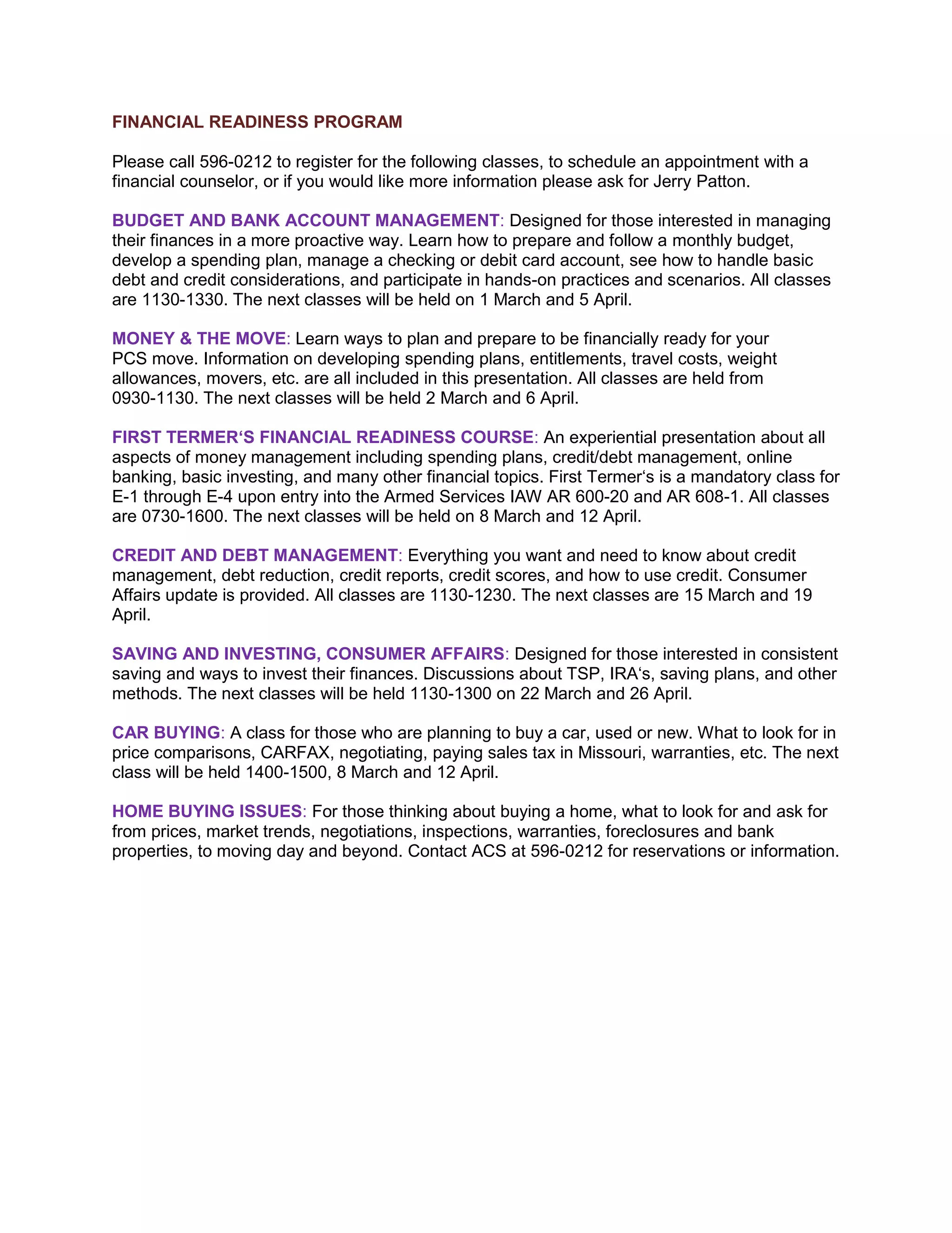 The document provides information about various financial readiness classes offered through the Financial Readiness Program. The classes cover topics such as budgeting, bank account management, preparing for a PCS move, mandatory training for new service members, credit and debt management, saving and investing, car buying, and home buying. Contact information is provided to register for classes or schedule an appointment with a financial counselor.