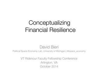 The document explores the concept of financial resilience, examining its relationship to both the financial and real sectors, and the policy tools necessary for achieving it. It discusses various definitions and theories of financial stability, the hierarchy of money, and the historical context of financial crises, particularly in relation to urban dynamics like those in Detroit. The interplay between financial systems and urban development is emphasized, showcasing the need for a macroprudential approach to regulate the interconnectedness of financial and real economies.