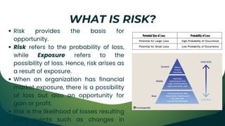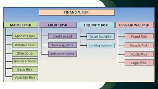 Financial risk management involves identifying risks an organization faces, assessing and quantifying those risks, defining strategies to manage them, implementing risk management strategies, and monitoring their effectiveness. Financial risks can arise from market exposures, transactions with other organizations, and internal failures. Key types of financial risk include market, credit, liquidity, and operational risk. Organizations manage financial risk through various strategies and products, often involving derivatives whose values are based on underlying assets.