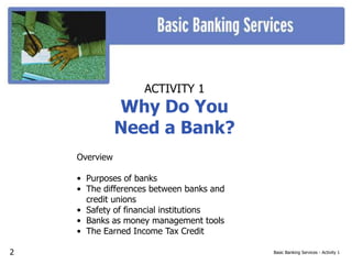 This document outlines 7 activities for teaching basic banking services: 1) why banks are needed and their services, 2) the various services banks provide, 3) checking accounts, 4) opening a checking account, 5) writing checks, 6) maintaining a checking account, and 7) savings accounts. Each activity contains slides on key topics like bank safety, electronic banking services, checking account terms, and opening and managing different types of bank accounts.