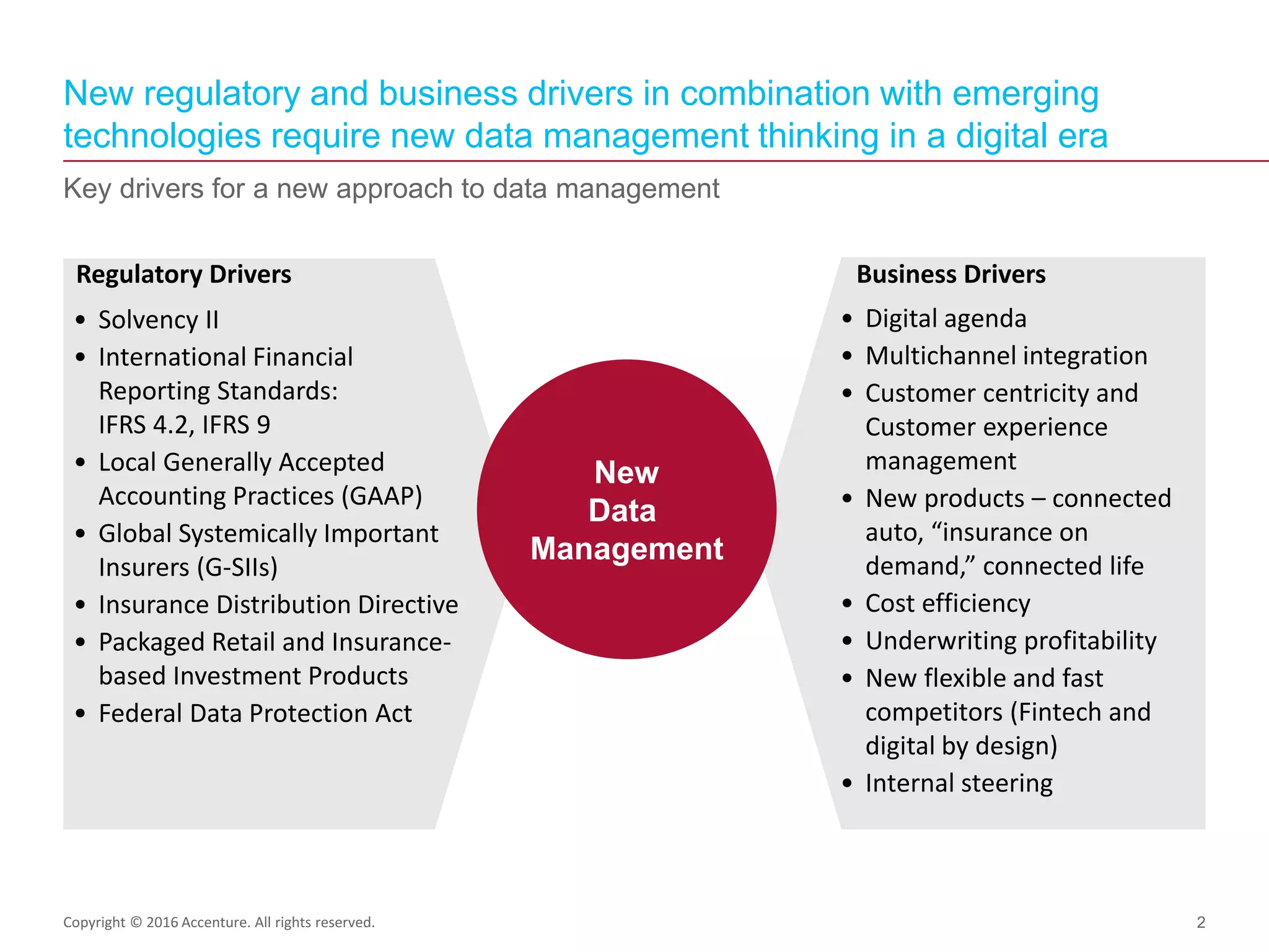 The document discusses the need for a new approach to data management in the digital era, driven by regulatory demands and emerging technologies that require data-centric thinking. It emphasizes the importance of data governance, quality management, and the integration of advanced technologies to enhance decision-making and operational efficiency for organizations like insurers. Furthermore, it outlines the role of Accenture's data governance suite in addressing these challenges and delivering high-quality data for strategic business insights.