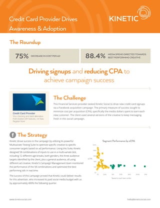 A financial services provider collaborated with Kinetic Social to drive credit card signups through a Facebook campaign. The campaign successfully minimized cost per acquisition (CPA) by utilizing multivariate testing with 58 ad combinations tailored to specific consumer targets. As a result of the campaign's effectiveness, the client increased their paid social media budget by approximately 400% in the following quarter.