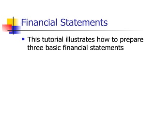 This document provides a tutorial on preparing three basic financial statements: the income statement, statement of retained earnings, and balance sheet. It explains the purpose and format of each statement. The income statement reports revenues, expenses and net income for a period. The statement of retained earnings shows the changes in retained earnings from net income and dividends. The balance sheet reports assets, liabilities, and equity as of a point in time. The tutorial also discusses the accounts that make up each statement and the order they should be prepared.