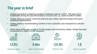 In 2021, Veritas achieved a remarkable investment return of 12.6%, greatly improving its solvency ratio to 131.9% and expanding its customer base to 78,000 insured individuals. The financial performance was bolstered by successful equity investments yielding 25.2% returns, alongside record payouts of over EUR 600 million in pensions. Overall, the company's strong financial health and customer growth are highlighted by an increase in premiums written and a stable solvency position.