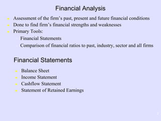 This document provides an overview of financial analysis and ratio analysis. It defines key financial statements, ratios, and financial analysis tools. It also provides examples of calculating ratios for Dell and comparing them to industry averages. The document aims to explain how ratios can be used to evaluate a firm's financial performance, strengths, and weaknesses over time and relative to peers.